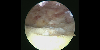 - Healthy vs Damaged cartilage – Arthroscopic view of healthy ankle cartilage on the right and damaged ankle joint on the left.