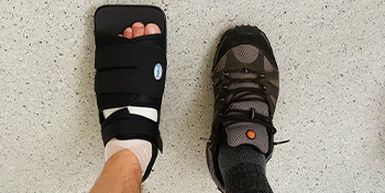 - Day 0 – About to leave the hospital wearing the post-operative shoe to allow walking from the day of surgery.